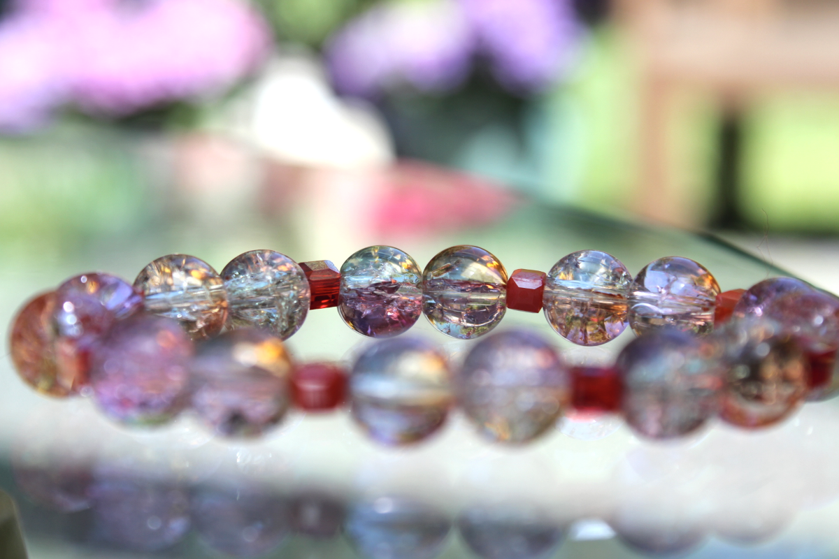 Dieses Armband ist wie ein Stück Sommer eingefangen in Glas – klar, funkelnd, farbenreich. Es erinnert an Spiegelungen im Wasser, Himbeersaft auf Eis oder ein Feuerwerk bei Sonnenuntergang: lebendig, zart und voller kleiner Lichtmomente.
