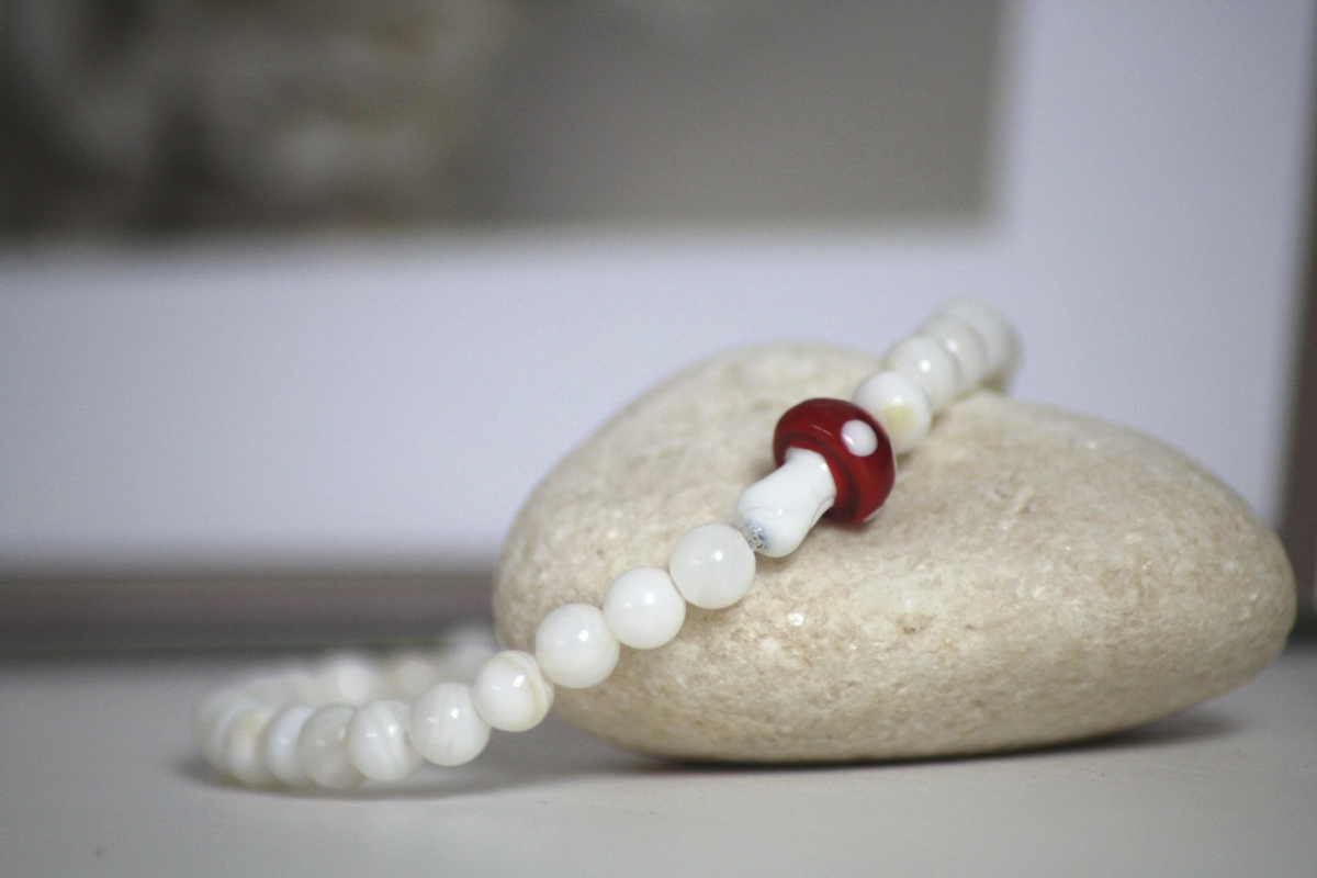 Dieses verspielte Armband vereint schlichte Eleganz mit einem Hauch Magie. Die zarten, weißen Keramikperlen strahlen in natürlichem Glanz und erinnern an feine Muscheln oder poliertes Porzellan. Ihr ruhiges Farbspiel lässt den kleinen, handgefertigten Glückspilz in kräftigem Rot mit weißen Punkten ganz besonders leuchten – ein fröhlicher Akzent, der sofort ein Lächeln zaubert.