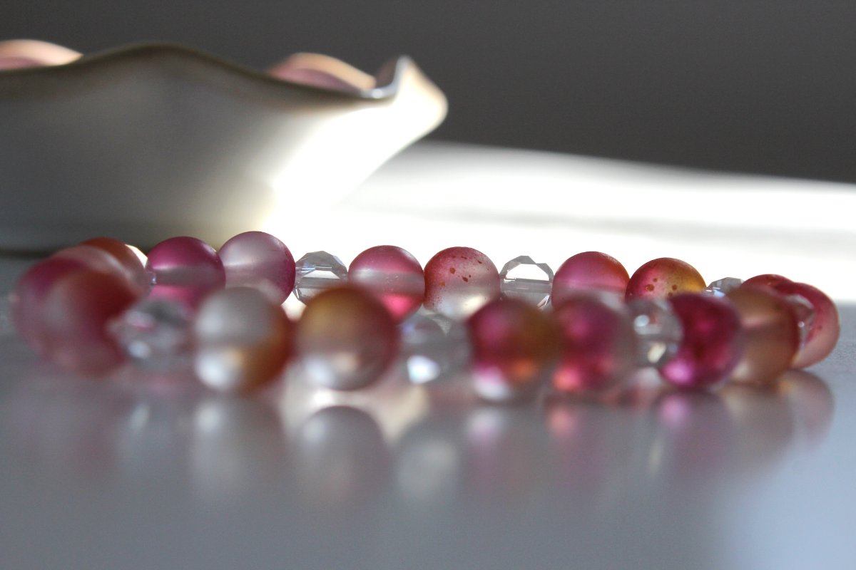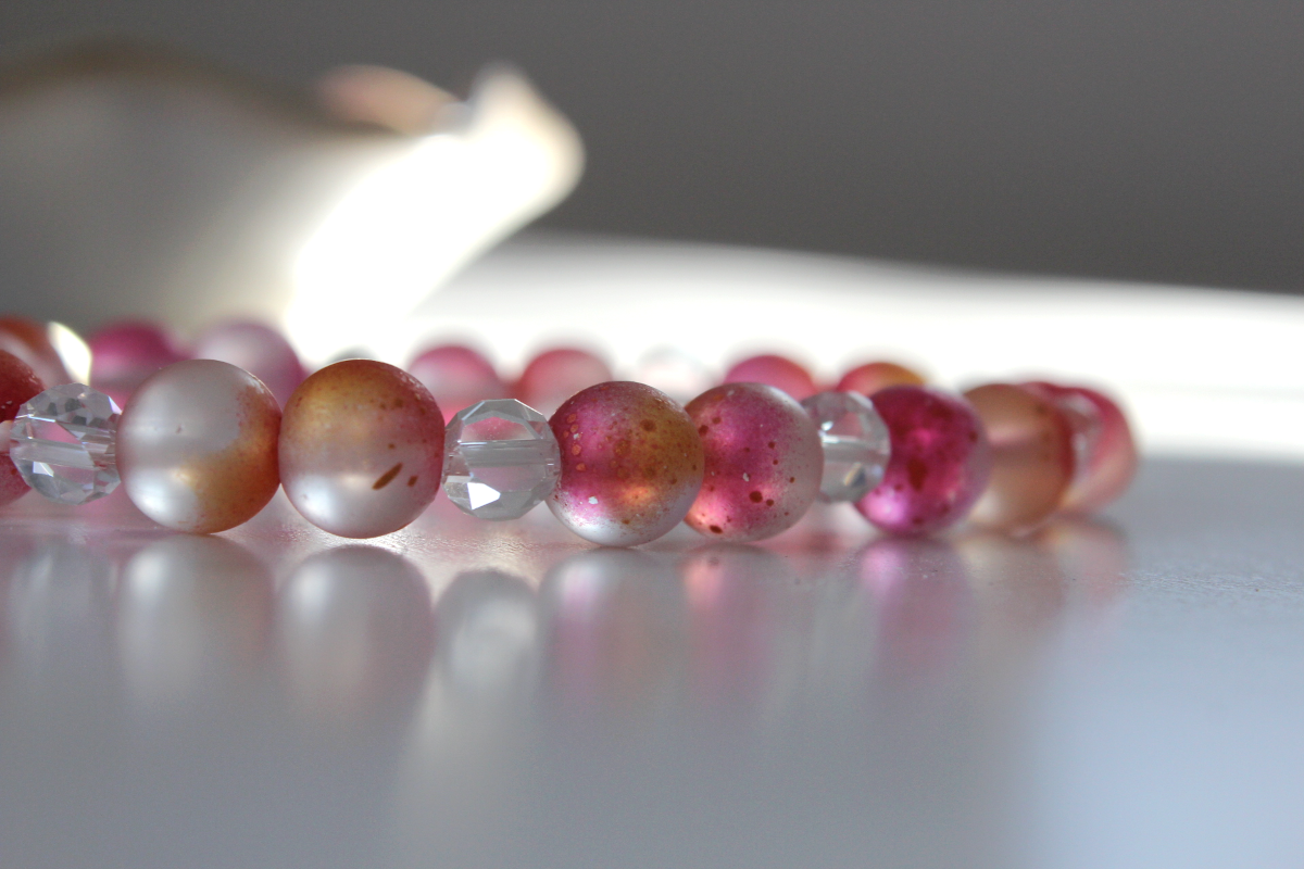 Die leicht schimmernden Kugeln in Rosé - Orange, Gold und transparentem Kristall changieren je nach Lichteinfall – und machen dieses Schmuckstück zu einem ganz besonderen Hingucker. Ideal für den Alltag oder als feines Accessoire zu besonderen Anlässen.