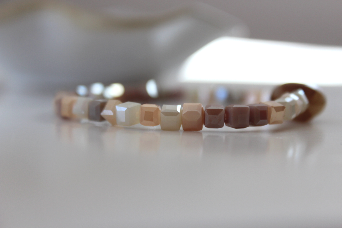 Dieses Armband überzeugt mit einem modernen Look und natürlicher Eleganz. Die hochwertigen, facettierten Glaswürfel reflektieren das Licht mit einem feinen Schimmer, während die sanfte Farbpalette aus Taupe, Sand und Elfenbein für zeitlose Schlichtheit sorgt.