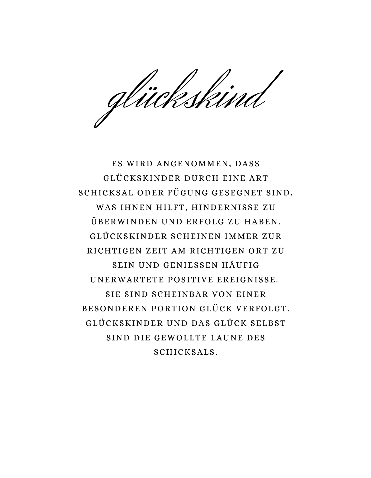 Manche Menschen scheinen vom Leben geküsst – kleine Glücksmomente begleiten sie und Wünsche erfüllen sich fast von selbst. Genau dieses Gefühl fängt unser „Glückskind“-Print ein: eine Botschaft voller Glückseligkeit, Leichtigkeit und Lebensfreude.